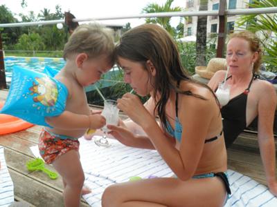 Boaz deelt heel lief samen met nichtje Dewi een milkshake aan de kant van het zwembad in Royal Torarica in Paramribo.