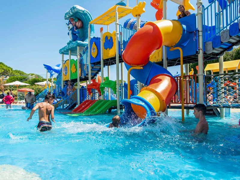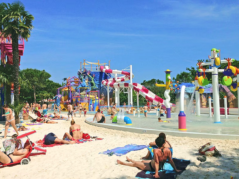 Aqua Park Laguna ligt centraal op de camping. Dit is maar liefst 10.000 m² groot, mooi aangelegd met prachtig wit zand en palmbomen. Hier staan een aantal ligbedden en parasolletjes klaar, maar je kunt overal je handdoek neerleggen om te zonnebaden. Je telt hier 8 waterglijbanen tot wel 10 meter hoog in vrolijke kleuren. Een indrukwekkend plaatje.