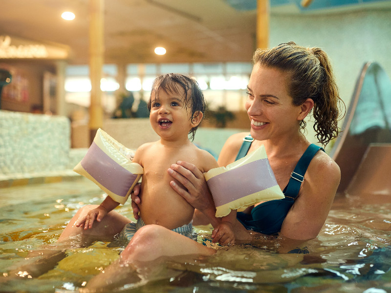 Waterpret in Aqua Mundo. De tropische zwembaden van Center Parcs zijn bij kinderen favoriet. Met wildwaterbanen, glijbanen en peuterbaden is het elke dag feest. Ouders relaxen ondertussen in het bubbelbad of op het terras met een drankje.