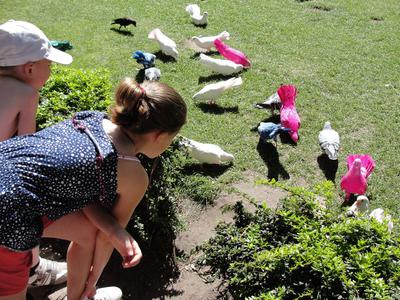 Wat fijn dat de duiven zo dicht bij komen, zelfs uit je hand komen ze eten. Onze 1e ervaring met zulke gekleurde dieren :-)