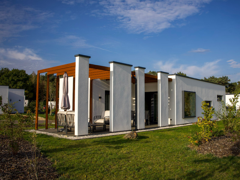 De villa’s ogen aan de voorkant wat saai en gesloten, maar schijn bedriegt, ze zijn allemaal gericht op zo veel mogelijk privacy op je eigen terras.