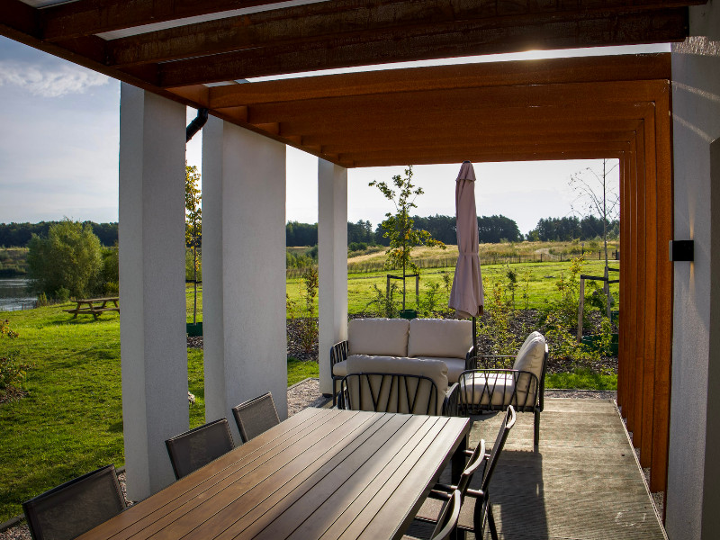 Wij verblijven in de Pietersheim Cottage Waterfront 6. Dit is een mooie 6-persoons villa met uitzicht over een waterplas en veel groen.