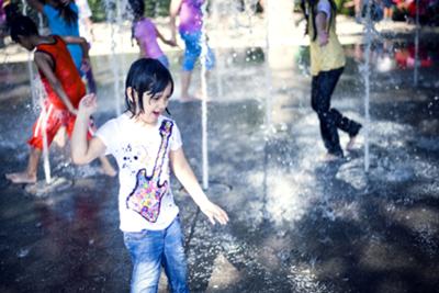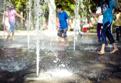Deze zomer trof ik deze spelende kinderen aan in New York. Terwijl ik natuurlijk kwam voor de wolkenkrabbers en de gele taxi's, werd mijn aandacht getrokken door deze 'fontijnen' op een pleintje, waar de kinderen gillend doorheen renden.