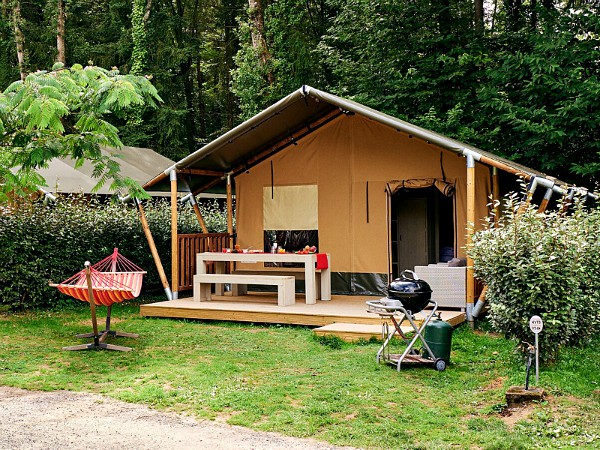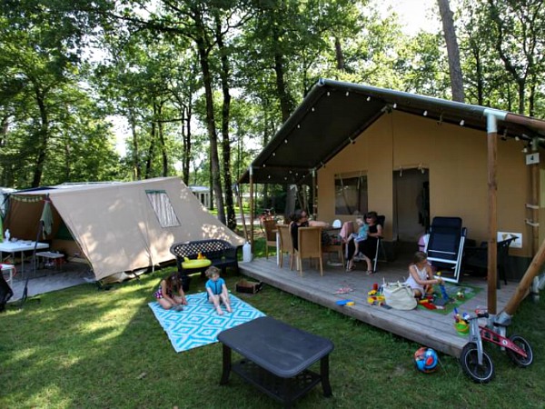 safaritent, of een nog luxere lodgetent. Die laatste heeft zelfs een douche, extra speelruimte en een eigen konijn bij de tent.