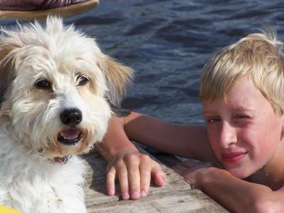 Hier zie je Siebren met een hondje van de camping. Op de camping waren veel honden, maar dit was een speciaal vriendje.