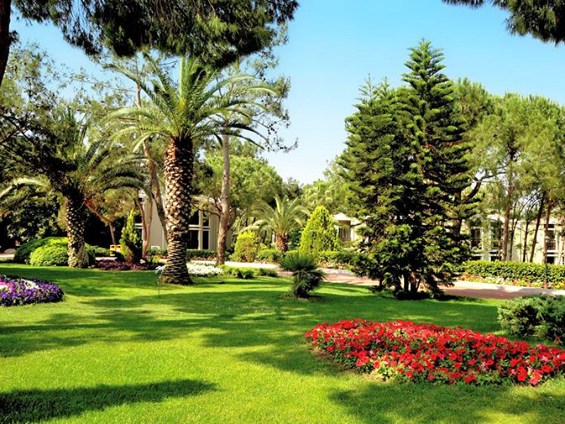Stel je voor: je wordt wakker na een heerlijke nachtrust. Je opent de gordijnen, stapt het terras op en je springt zo het zwembad in! Dat kan bij Hotel Club Mega Saray in Belek. Je zwemt (of loopt) door de prachtige tuinen in dit dorps aangelegde resort.