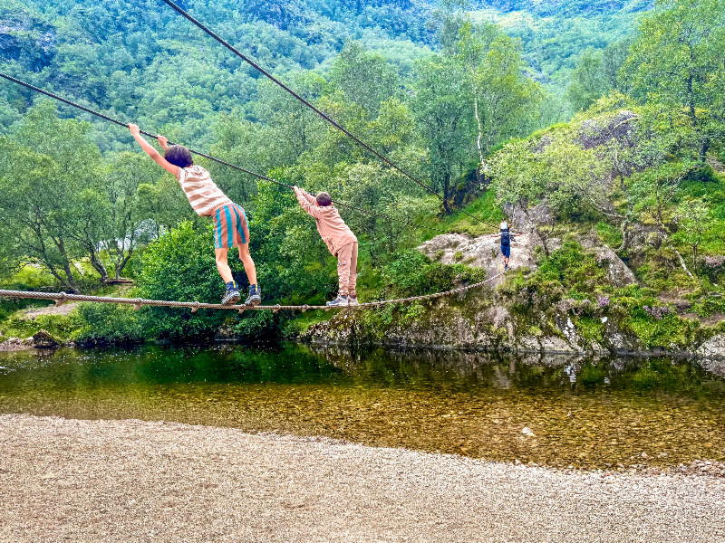 Deze korte maar avontuurlijke route (ongeveer 3 km enkele reis) start in Glen Nevis en loopt door een groen dal langs een kabbelende rivier. Onderweg steek je een beek over via stenen en (voor de wat langere durfals) over een touwbrug!