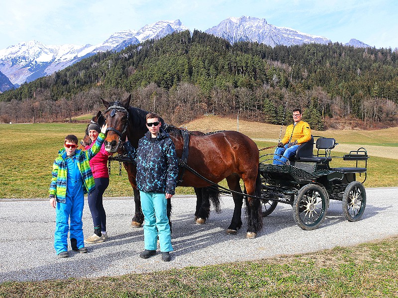 Andere dieren, waar je mee op pad kunt gaan, zijn paarden. Aangezien mijn jongens gek op paarden zijn, vooral de oudste, mogen wij genieten van een mooie tocht met paard en wagen in het dal, met prachtig uitzicht op het Karwendel-gebergte.