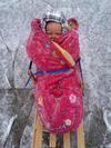 Yannique als ‘sneeuwpop’ op de slee tijdens een schaatstocht