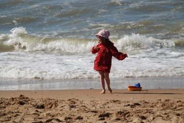 Een opmerkelijk schouwspel houd me bezig: met een flinke bries in haar rug, sjokt een klein meisje, met een speelgoedbootje achter zich voorttrekkend over een zo goed als verlaten strand.
