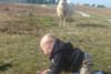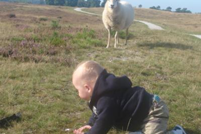 Even verderop zag hij schaapjes lopen en ook dat is reuze interessant en daar kroop hij dan ook snel heen.